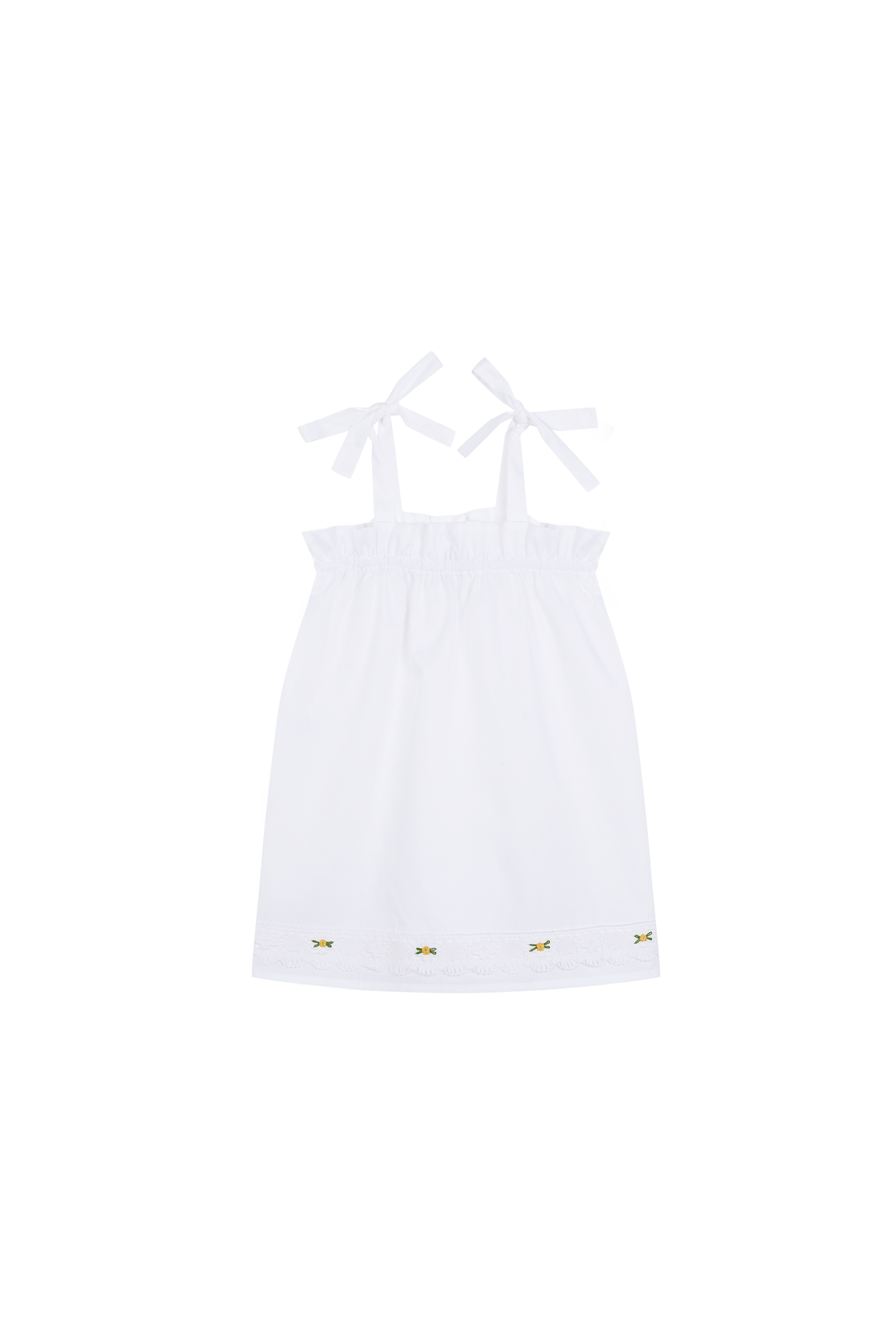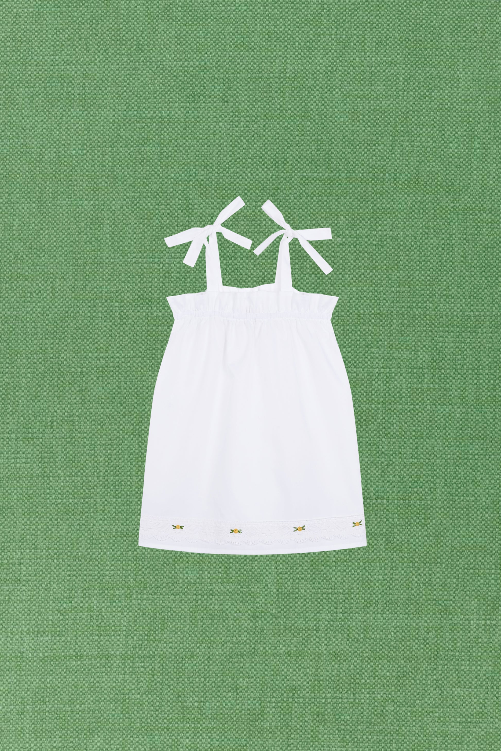 White cotton dress inspired by sunlit afternoons, the scent of orange blossoms, sandy beaches, and olive groves. Featuring delicate straps, hand-embroidered yellow roses, and a lace-trimmed hem, it is light, breathable, and perfect for warm southern summer days. The roses hold a special meaning — they were the very first stitches my grandmother taught me — a small gesture of love and craft carried into this piece.
