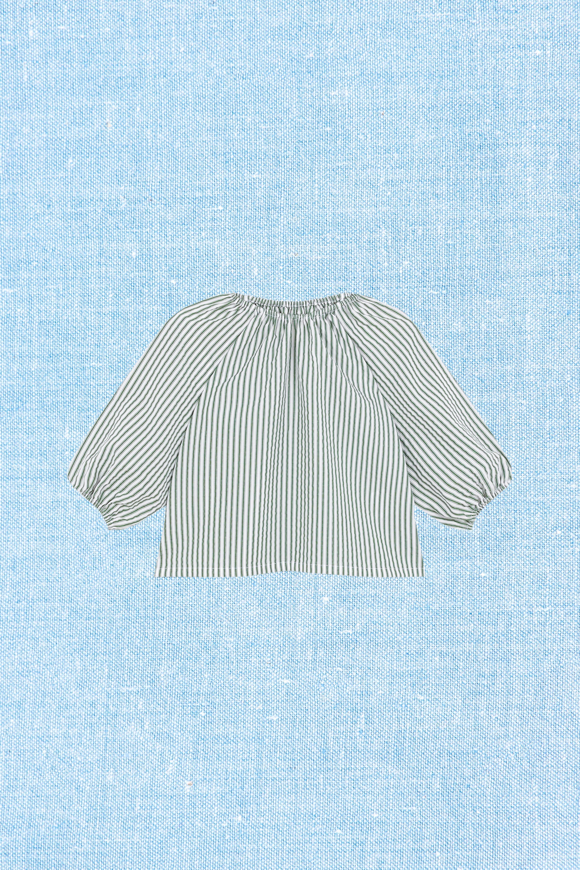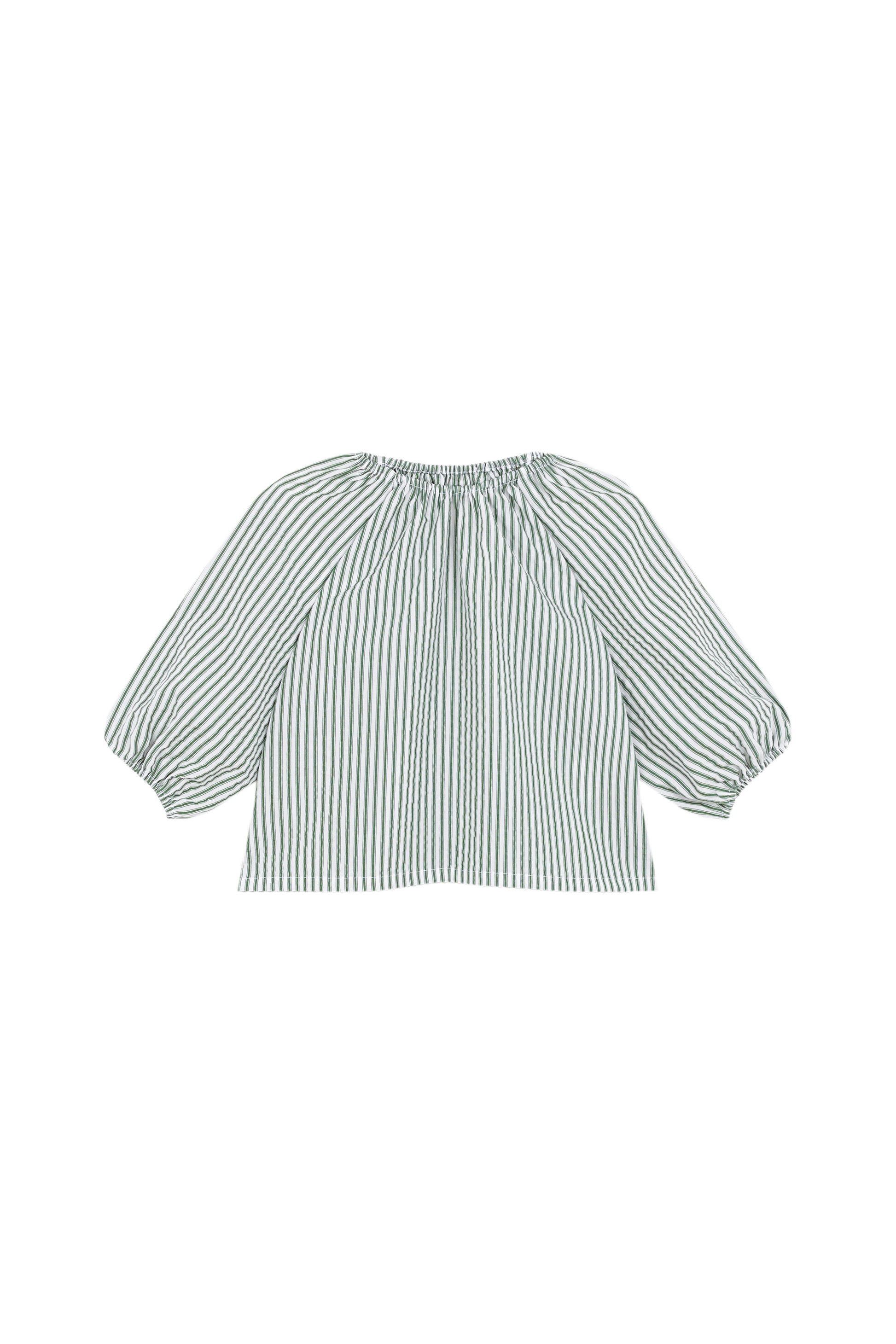 With olive green and white stripes reminiscent of sun-washed awnings and slow Mediterranean afternoons, this lightweight cotton balloon blouse is soft, breathable, and easy to wear. Its airy silhouette allows little ones to move freely while bringing a playful, timeless charm to warm summer days.